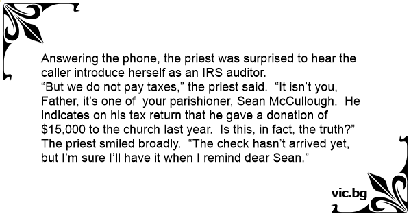 “But we do not pay taxes,” the priest said. “It isn’t you, Father, it’s one of your parishioner, Sean McCullough. He indicates on his tax return that he gave a donation of
