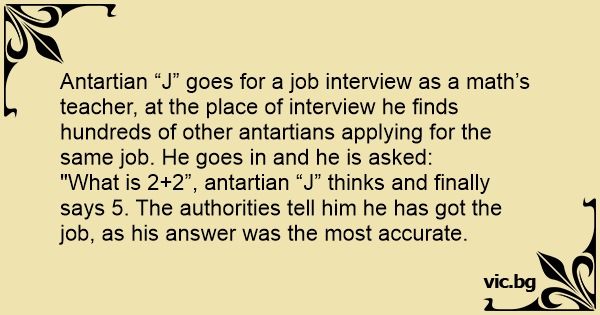 "What is 2+2”, antartian “J” thinks and finally says 5. The authorities tell him he has got the job, as his answer was the most accurate.