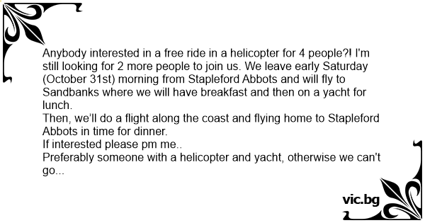 Anybody interested in a free ride in a helicopter for 4 people?! I'm still looking for 2 more people to join us. We leave early Saturday (October 31st) morning from Stapleford Abbots and will fly to Sandbanks where we will have breakfast and then on a yacht for lunch.