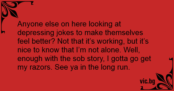 Anyone else on here looking at depressing jokes to make themselves feel better? Not that it’s working, but it’s nice to know that I’m not alone. Well, enough with the sob story, I gotta go get my razors. See ya in the long run.