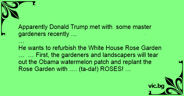 He wants to refurbish the White House Rose Garden … … First, the gardeners and landscapers will tear out the Obama watermelon patch and replant the Rose Garden with …. (ta-da!) ROSES! …