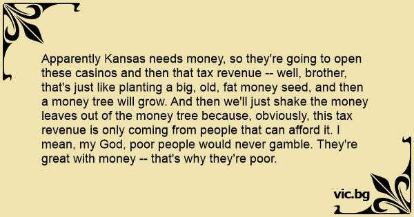 Apparently Kansas needs money, so they're going to open these casinos and then that tax revenue -- well, brother, that's just like planting a big, old, fат money seed, and then a money tree will grow. And then we'll just shake the money leaves out of the money tree because, obviously, this tax revenue is only coming from people that can afford it. I mean, my God, poor people would never gamble. They're great with money -- that's why they're poor.