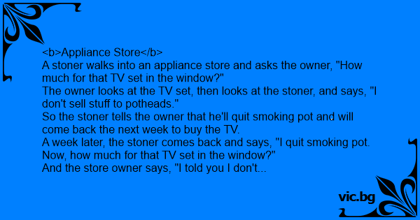 A week later, the stoner comes back and says, "I quit smoking рот. Now, how much for that TV set in the window?"