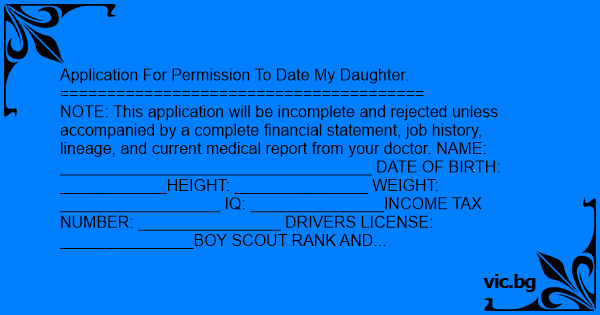 - _________________________________________________________________Applicant's Signature (that means sign your name, моrоn!)_______________________________ ____________________________Mother's Signature Father's SignaturePastor/Priest/Rabbi State or Federal Government Representative_______________________________ (Their stamp goes here)Notary PublicThank you for your interest, and it had better be genuine and non-sеxuаl. Please allow four to six years for processing. You will be contacted in writing if you are approved. Please do not try to call or write. If your application is rejected, you will be notified by two gentleman wearing white ties carrying violin cases. (You might watch your back)To prepare yourself, start studying Daddy's Rules for Dating. Daddy's Rules for DatingYour dad's rules for your boyfriend (or for you if you're a guy):Rule One: If you pull into my driveway and beep you'd better be delivering a package, because you're sure not picking anything up. Rule Two: You do not touch my daughter in front of me. You may glance at her so long as you do not peer at anything below her neck. If you cannot keep your eyes or hands off of my daughter's body, I will remove them. Rule Three: I am aware that it is considered fashionable for boys of your age to wear their trousers so loosely that they appear to be falling off their hips. Please don't take this as an insult, but you and all of your friends are complete idiots. Still, I want to be fair and open minded about this issue, so I propose this compromise: You may come to the door with your underwear showing and your pants ten sizes too big, and I will not object. However, in order to ensure that your clothes do not, in fact come off during the course of your date with my daughter, I will take my electric nail gun and fasten your trousers securely in place to your waist. Rule Four: I'm sure you've been told that in today's world sеx without utilizing a 'Barrier method' of some kind can кill you. Let me elaborate, when it comes to sеx, I am the barrier, and I will кill you. Rule Five: It is usually understood that in order for us to get to know each other, we should talk about sports, politics, and other issues of the day. Please do not do this. The only information I require from you is an indication of when you expect to have my daughter safely back at my house, and the only word I need from you on this subject is:
