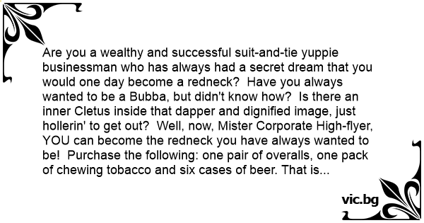Are you a wealthy and successful suit-and-tie yuppie businessman who has always had a secret dream that you would one day become a redneck? Have you always wanted to be a Bubba, but didn't know how? Is there an inner Cletus inside that dapper and dignified image, just hollerin' to get out? Well, now, Mister Corporate High-flyer, YOU can become the redneck you have always wanted to be! Purchase the following: one pair of overalls, one pack of chewing tobacco and six cases of вееr. That is all you will need to start! Now follow the 35 SIMPLE and EASY guidelines in our manual! Caution: These instructions MUST be followed in your BUSINESS OFFICE during WORKING HOURS. 1) We assume you are a dignified, well-groomed yuppie executive; therefore, as you read this, it is also assumed you are wearing a pair of well-polished $800 Brooks Brothers black captoe leather shoes and silk business socks, a $2,000 pinstriped Armani business suit tailored for you, a $150 silk necktie with matching pocket square and suspenders, a starched white shirt, monogrammed cufflinks, silver tiepin and a Rolex. If you are not dressed like this, stop NOW and continue when you are. FIRST, untie and remove high-and-mighty mirror-shined executive shoes. Peel off fancy socks. DO THIS NOW! This is NOT optional! Be warned: these shoes and socks have been vital to your identity until now, so do not deceive yourself; this will be a challenge to a true yuppie executive. They MUST be removed to move forward into the wonderful new world that awaits you. (Note: This will also work with Johnston & Murphy wingtips or those Italian loafers with those little tassels on them.) 2) Stuff silk socks in shiny shoes and drop in garbage can. 3) *URGENT* Do not, under any circumstances, put shoes back on. You MUST remain barefoot. If you fail, return to step one. This will take discipline! This is where most would-be bubbas fail! You will be tempted to put them back on - resist this! If you have trouble, don't hesitate to call our 800 emergency number. A bona fide trained Bubba coach will help you. 4) The following is guaranteed to help bring you off your high horse in a hurry, and into the redneck world! Trust us! Prop bare feet on polished office desk, with soles facing open office door. Do NOT remove feet from desk, even when co-workers, clients and/or boss enter office. 5) Remove cufflinks and scratch soles of feet with them when others enter office and during office conference. Put cufflinks back on. 6) Use necktie to wipe nose. 7) Use tiepin and/or collar stud to clean toenails. Put tiepin or collar stud back in tie or shirt. Eat lunch with knife only. Wipe dirтy knife on otherwise spotless business suit. 9) Reach under suit trouser leg and scratch. Scratch under arms. 10) Open can of вееr. Drink rapidly and belch loudly. Practice! Dribble on business suit. Discarded business socks may be used to wipe mouth. Repeat. Pile cans on expensive office carpet. 11) Shout with laughter for no reason. Note: Do NOT be concerned if you experience concern about your dignity. Your dignity will soon disappear! Do not worry! 12) Place tobacco in mouth; place in back of cheek. Practice spitting streams of tobacco juice on to computer screen, or on polished office floor, or on important presentation, or in the cuffs of the trousers of your pinstriped suit. Brooks Brothers shoes may also serve as spittoon. Note: This is the ONLY time when you may retrieve shoes from garbage! See Step #3. 13) Untie and remove natty silk necktie, unfasten and remove gold monogrammed cufflinks, pluck pocket square from suit, unfasten tiepin, unbutton and pull out suspenders and slide Rolex off wrist. Drop ALL items in garbage can. 14) Sтriр off classy, expensive tailored Armani business suit, starched shirt and designer underwear. Toss in garbage can. Note: Removal of business suit can be traumatic for an uppity upper class businessman. It is comparable to an operation. Be prepared for shock to system. 15) Add briefcase, cell phone and day-timer. 16) Cut up credit cards and throw away wallet. 17) Cut up Ivy League degree. 18) Put on overalls. Walk around in hem to get used to your new look. 19) Practice poor posture and sluggish walk. 20) Cancel subscriptions to Wall Street Journal and New York Times. Have cable disconnected. 21) If you have not already been fired, quit high-paying prestigious white-collar job and stop working altogether. Alternative: become a garbage man or janitor or sling hash in a diner. 22) Make appointment with dentist. Have front teeth removed. 23) Make appointment with surgeon. Have all hair on top of head removed through electrolysis. Let hair grow on sides and back. 24) Shave ONLY twice a week. Be careful to leave stubble at all times. 25) Bathe ONLY twice a week. 26) Begin intensive redneck language course. Do not use more than five words in a sentence. Drop all "NG" endings from words - "havin" instead of "having". Learn to yelp and whoop and holler. 27) Sell Porsche. 28) Buy used pickup. 29) Sell condo. 30) Buy dilapidated shack in backwoods and shotgun rack. 31) Give or throw away all remaining clothes: business suits, ties, shoes, socks, shirts, and accessories, including Burberry tuxedo, overcoat and patent leather pumps worn to corporate black tie events. NOTHING can be retained. 32) Sell stocks and bonds and give all proceeds from these and sale of car and home to a redneck charity. You will NOT need money. 33) Watch NASCAR and pro-wrestling every day. Do NOT miss any episodes. 34) Find wrecked car and leave in front of shack. 35) Have name changed legally from "Mark" or "Andrew" or "Kevin" to "Cletus" or "Bubba" or "Jed". Congratulations! You, Sir, are now the Redneck you have dreamed of becoming! Satisfaction Guaranteed! And no one will ever call you "sir" again!