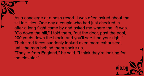 As a concierge at a posh resort, I was often asked about the ski facilities. One day a couple who had just checked in after a long flight came by and asked me where the lift was.
