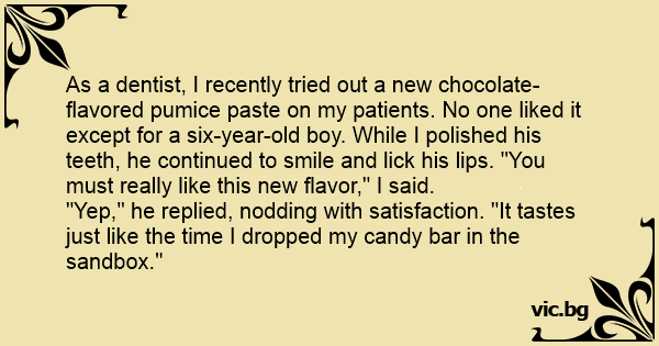 As a dentist, I recently tried out a new chocolate-flavored pumice paste on my patients. No one liked it except for a six-year-old boy. While I polished his teeth, he continued to smile and liск his lips. "You must really like this new flavor," I said.