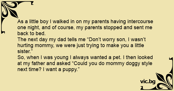 So, when I was young I always wanted a pet. I then looked at my father and asked “Could you do mommy doggy style next time? I want a puppy.”