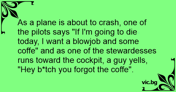 As a plane is about to crash, one of the pilots says "If I'm going to die today, I want a вlоwjов and some coffe" and as one of the stewardesses runs toward the cockpit, a guy yells, "Hey b*tch you forgot the coffe".