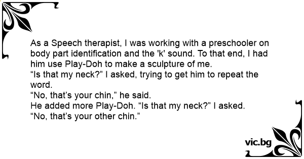As a Speech therapist, I was working with a preschooler on body part identification and the 'k' sound. To that end, I had him use Play-Doh to make a sculpture of me.