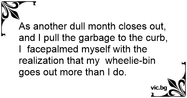 As another dull month closes out, and I pull the garbage to the curb, I facepalmed myself with the realization that my wheelie-bin goes out more than I do.