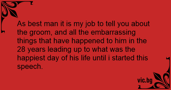 As best man it is my job to tell you about the groom, and all the embarrassing things that have happened to him in the 28 years leading up to what was the happiest day of his life until i started this speech.