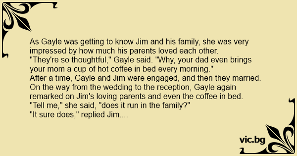 After a time, Gayle and Jim were engaged, and then they married. On the way from the wedding to the reception, Gayle again remarked on Jim's loving parents and even the coffee in bed.