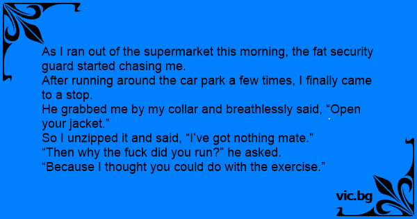 As I ran out of the supermarket this morning, the fат security guard started chasing me.
