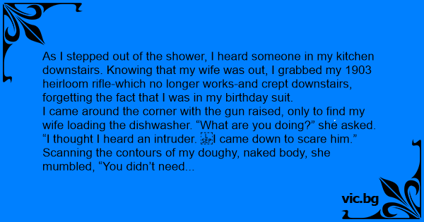 As I stepped out of the shower, I heard someone in my kitchen downstairs. Knowing that my wife was out, I grabbed my 1903 heirloom rifle-which no longer works-and crept downstairs, forgetting the fact that I was in my birthday suit.