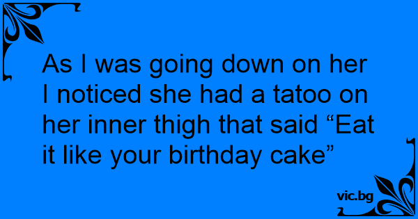 As I was going down on her I noticed she had a tatoo on her inner thigh that said “Eat it like your birthday cake”
