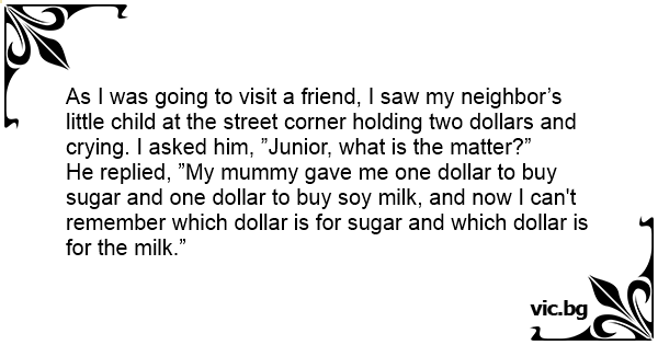 He replied, ”My mummy gave me one dollar to buy sugar and one dollar to buy soy milk, and now I can't remember which dollar is for sugar and which dollar is for the milk.”