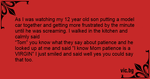“Tom" you know what they say about patience and he looked up at me and said "I know Mom patience is a VIRGIN" I just smiled and said well yes you could say that too.