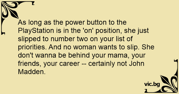 As long as the power button to the PlayStation is in the 'on' position, she just slipped to number two on your list of priorities. And no woman wants to slip. She don't wanna be behind your mama, your friends, your career -- certainly not John Madden.