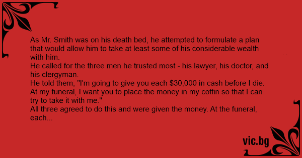 As Mr. Smith was on his death bed, he attempted to formulate a plan that would allow him to take at least some of his considerable wealth with him.