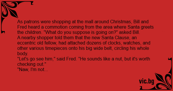 As patrons were shopping at the mall around Christmas, Bill and Fred heard a commotion coming from the area where Santa greets the children. "What do you suppose is going on?" asked Bill.