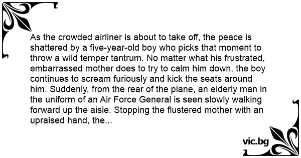 As the crowded airliner is about to take off, the peace is shattered by a five-year-old boy who picks that moment to throw a wild temper tantrum. No matter what his frustrated, embarrassed mother does to try to calm him down, the boy continues to scream furiously and kick the seats around him. Suddenly, from the rear of the plane, an elderly man in the uniform of an Air Force General is seen slowly walking forward up the aisle. Stopping the flustered mother with an upraised hand, the white-haired, courtly, soft-spoken General leans down and, motioning toward his chest, whispers something into the boy's ear.