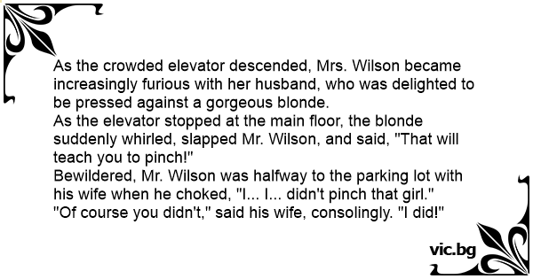 As the elevator stopped at the main floor, the blonde suddenly whirled, slapped Mr. Wilson, and said, "That will teach you to pinch!"