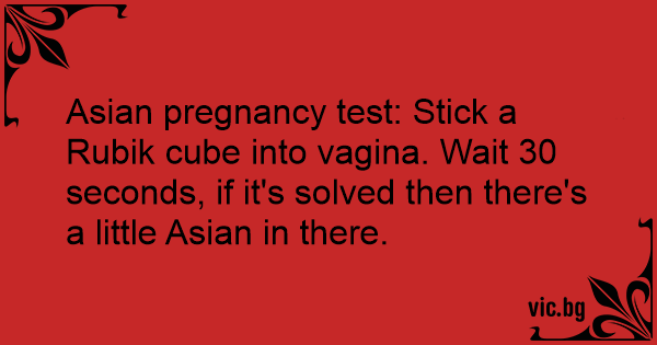 Asian pregnancy test: Stick a Rubik cube into vаginа. Wait 30 seconds, if it's solved then there's a little Asian in there.