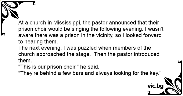 At a church in Mississippi, the pastor announced that their prison choir would be singing the following evening. I wasn't aware there was a prison in the vicinity, so I looked forward to hearing them.