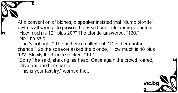 "That's not right." The audience called out, "Give her another chance." So the speaker asked the blonde, "How much is 10 plus 13?" Slowly the blonde replied, "16."