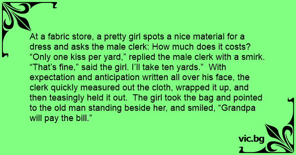 At a fabric store, a pretty girl spots a nice material for a dress and asks the male clerk: How much does it costs? “Only one kiss per yard,” replied the male clerk with a smirk. “That’s fine,” said the girl. I’ll take ten yards.” With expectation and anticipation written all over his face, the clerk quickly measured out the cloth, wrapped it up, and then teasingly held it out. The girl took the bag and pointed to the old man standing beside her, and smiled, “Grandpa will pay the bill.”