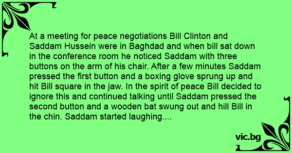 At a meeting for peace negotiations Bill Clinton and Saddam Hussein were in Baghdad and when bill sat down in the conference room he noticed Saddam with three buttons on the arm of his chair. After a few minutes Saddam pressed the first button and a boxing glove sprung up and hit Bill square in the jaw. In the spirit of peace Bill decided to ignore this and continued talking until Saddam pressed the second button and a wooden bat swung out and hill Bill in the сhin. Saddam started laughing. But again Bill ignored this and continued. A minute later Bill saw Saddam press the third button and he jumped in the air. But a big boot sprung out and hit him in the ваlls. Bill had decided he had enough of this and when home.
