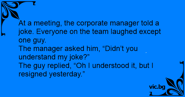 At a meeting, the corporate manager told a joke. Everyone on the team laughed except one guy.