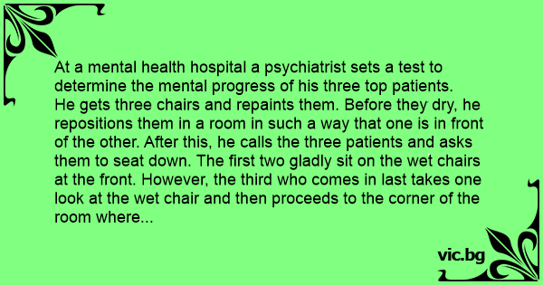 He gets three chairs and repaints them. Before they dry, he repositions them in a room in such a way that one is in front of the other. After this, he calls the three patients and asks them to seat down. The first two gladly sit on the wet chairs at the front. However, the third who comes in last takes one look at the wet chair and then proceeds to the corner of the room where there is a pile of papers. He takes one sheet which he drapes on the wet chair before sitting. Surprised by the action of the third, the doctor asks him why he draped the sheet of paper on the wet chair, "that's easy," came the reply, "seeing that am seated at the back, I needed to be a bit raised if I wanted to see what's happening at the front"