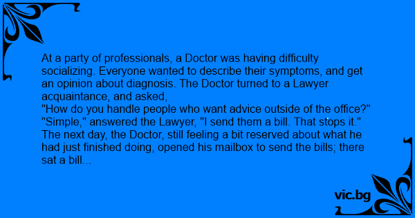 At a party of professionals, a Doctor was having difficulty socializing. Everyone wanted to describe their symptoms, and get an opinion about diagnosis. The Doctor turned to a Lawyer acquaintance, and asked,