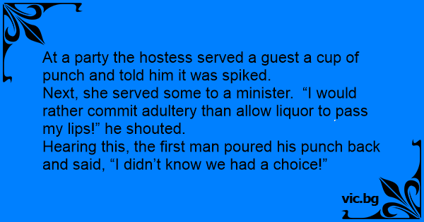 At a party the hostess served a guest a cup of punch and told him it was spiked.