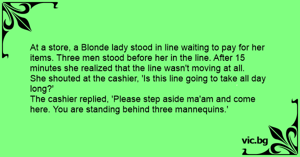 At a store, a Blonde lady stood in line waiting to pay for her items. Three men stood before her in the line. After 15 minutes she realized that the line wasn't moving at all.