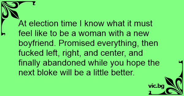 At election time I know what it must feel like to be a woman with a new boyfriend. Promised everything, then fuскеd left, right, and center, and finally abandoned while you hope the next bloke will be a little better.