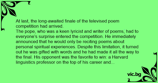 The pope, who was a keen lyricist and writer of poems, had to everyone’s surprise entered the competition. He immediately announced that he would only be reciting poems about personal spiritual experiences. Despite this limitation, it turned out he was gifted with words and he had made it all the way to the final. His opponent was the favorite to win: a Harvard linguistics professor on the top of his career and with a mind as sharp as a knife’s edge.