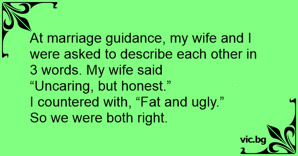 At marriage guidance, my wife and I were asked to describe each other in 3 words. My wife said