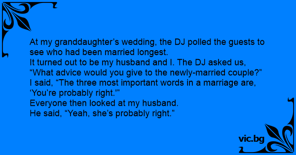 I said, “The three most important words in a marriage are, ‘You’re probably right.'”