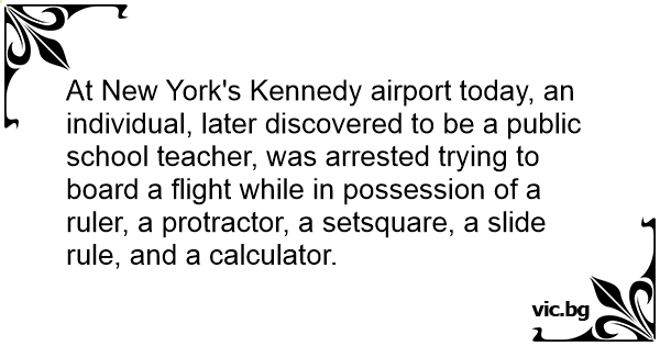 At New York's Kennedy airport today, an individual, later discovered to be a public school teacher, was arrested trying to board a flight while in possession of a ruler, a protractor, a setsquare, a slide rule, and a calculator.
