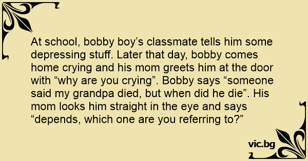 At school, bobby boy’s classmate tells him some depressing stuff. Later that day, bobby comes home crying and his mom greets him at the door with “why are you crying”. Bobby says “someone said my grandpa died, but when did he die”. His mom looks him straight in the eye and says “depends, which one are you referring to?”