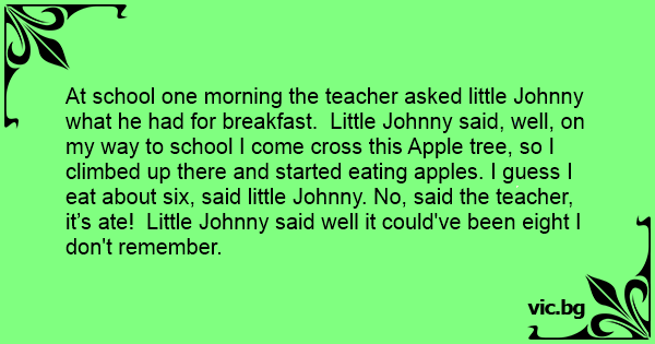 At school one morning the teacher asked little Johnny what he had for breakfast. Little Johnny said, well, on my way to school I come cross this Apple tree, so I climbed up there and started eating apples. I guess I eat about six, said little Johnny. No, said the teacher, it’s ate! Little Johnny said well it could've been eight I don't remember.