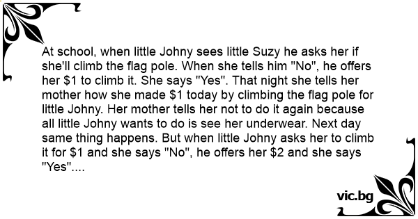 At school, when little Johny sees little Suzy he asks her if she'll climb the flag pole. When she tells him "No", he offers her $1 to climb it. She says "Yes". That night she tells her mother how she made $1 today by climbing the flag pole for little Johny. Her mother tells her not to do it again because all little Johny wants to do is see her underwear. Next day same thing happens. But when little Johny asks her to climb it for $1 and she says "No", he offers her $2 and she says "Yes". Again, she tells her mother this time how she made $2 climbing the flag pole. Her mother yells at her and tells her not to do it again because all little Johny wants to do is see her underwear. Next day same thing happens. But when little Johny offers her $1 to climb it and she says "No", he offers her $2 again but she still says "No". This time he offers her $5 and she says "Yes". Again, she tells her mother this time how she made $5 climbing the flag pole.
