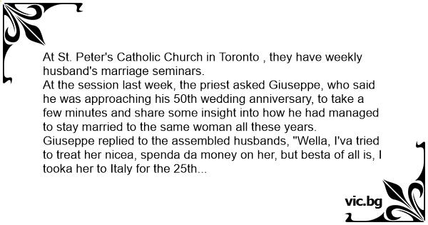 At the session last week, the priest asked Giuseppe, who said he was approaching his 50th wedding anniversary, to take a few minutes and share some insight into how he had managed to stay married to the same woman all these years.