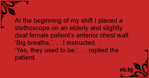 At the beginning of my shift I placed a stethoscope on an elderly and slightly deaf female patient’s anterior chest wall.