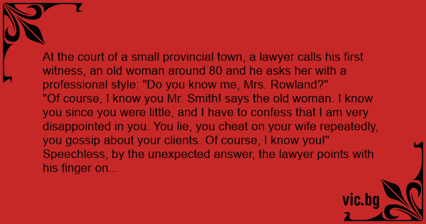 At the court of a small provincial town, a lawyer calls his first witness, an old woman around 80 and he asks her with a professional style: "Do you know me, Mrs. Rowland?"