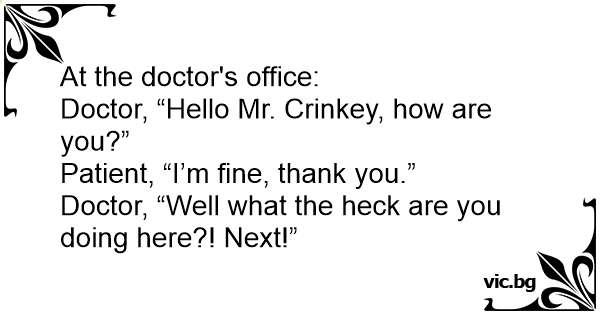 Doctor, “Hello Mr. Crinkey, how are you?”