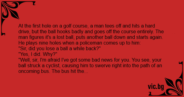 At the first hole on a golf course, a man tees off and hits a hard drive, but the ball hooks badly and goes off the course entirely. The man figures it's a lost ball, puts another ball down and starts again. He plays nine holes when a policeman comes up to him: